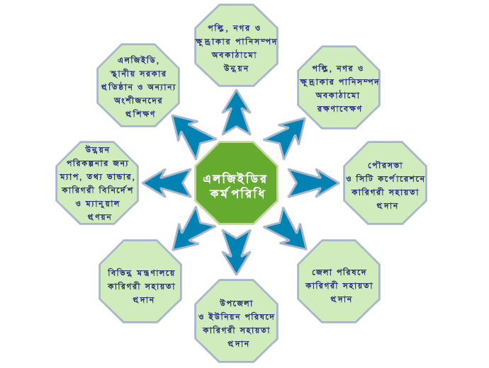 স্থানীয় পর্যায়ে গ্রামীণ ও নগর অবকাঠামো উন্নয়নের পাশাপাশি এসব অবকাঠামো রক্ষণাবেক্ষণ এবং স্থানীয় সরকার প্রতিষ্ঠানসমূহকে বিভিন্ন বিষয়ে কারিগরি সহায়তা প্রদান এলজিইডির কর্মতালিকার অংশ। একইসঙ্গে বিভিন্ন মন্ত্রণালয়ে প্রয়োজনীয় কারিগরি সহায়তা দিয়ে থাকে এলজিইডি।